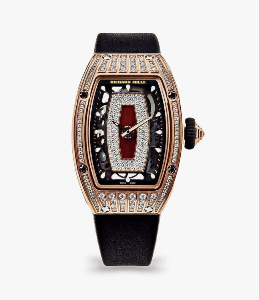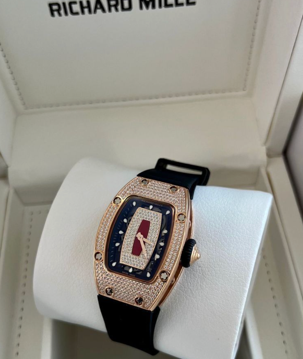 This luxury timepiece features Richard Mille’s iconic tonneau-shaped case with a skeletonized dial, showcasing the brand’s signature high-performance watchmaking design.